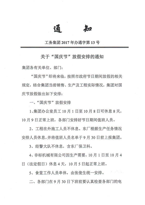工務(wù)集團2017年辦通字第13號《關(guān)于“國慶節(jié)”放假安排的通知》